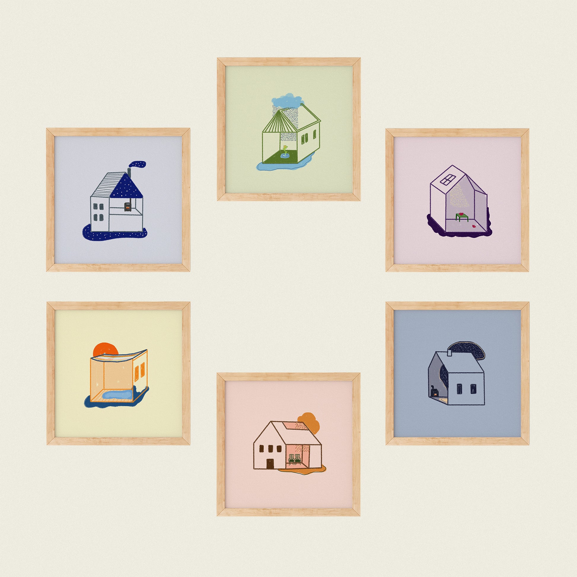 A curated series of six tiny house illustrations, celebrating quiet living. Each print is digitally produced on slightly warm, off-white, 300 g textured paper, giving the illustrations a soft, tactile feel.
